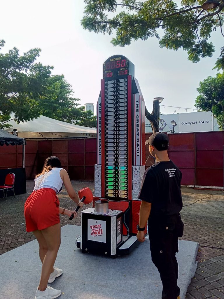 king of the hammer merupakan game high striker modern. Alih-alih keping hoki, skornya diwakili oleh lampu yang menyala untuk menunjukkan kekuatan pukulan.Striker tinggi hadir dalam berbagai bentuk dan ukuran. Ketinggian berkisar antara 4 hingga 20 kaki (1,2 hingga 6,1 meter). Ada banyak merek high striker yang tersedia secara komersial. Kebanyakan model menggunakan tuas pegas yang dapat disesuaikan untuk menambah atau mengurangi gaya yang diperlukan untuk mendorong keping agar mengenai bel. king hammer ini tingginya sampai 3 meter.